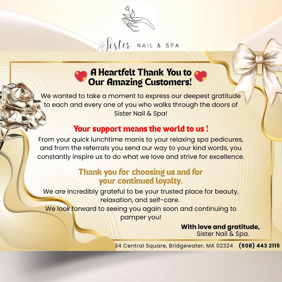 Located at a beautiful place in Bridgewater, MA 02324, Sister Nail & Spa offers you the ultimate in pampering and boosting your natural beauty with our whole-hearted, creative & professional staff.